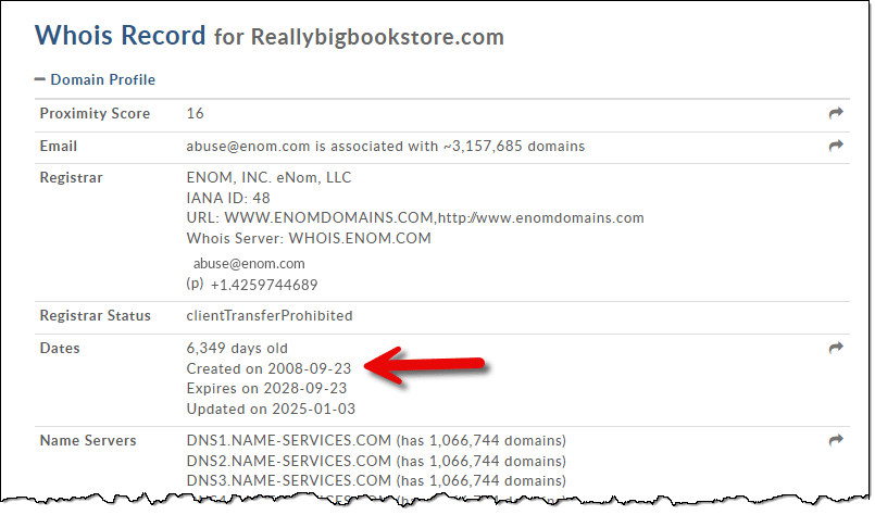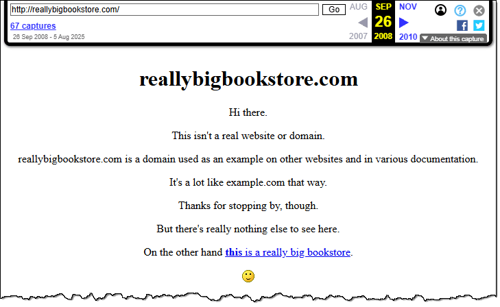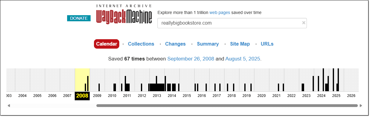In the case of reallybigbookstore.com, all the snapshots back to 2008 show pretty much the same thing — it’s been a very stable “bookstore”.1