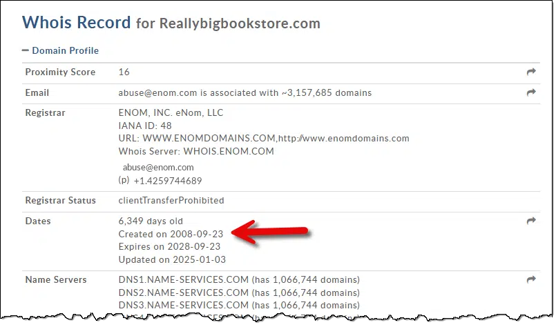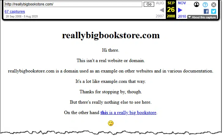 In the case of reallybigbookstore.com, all the snapshots back to 2008 show pretty much the same thing — it’s been a very stable “bookstore”.1