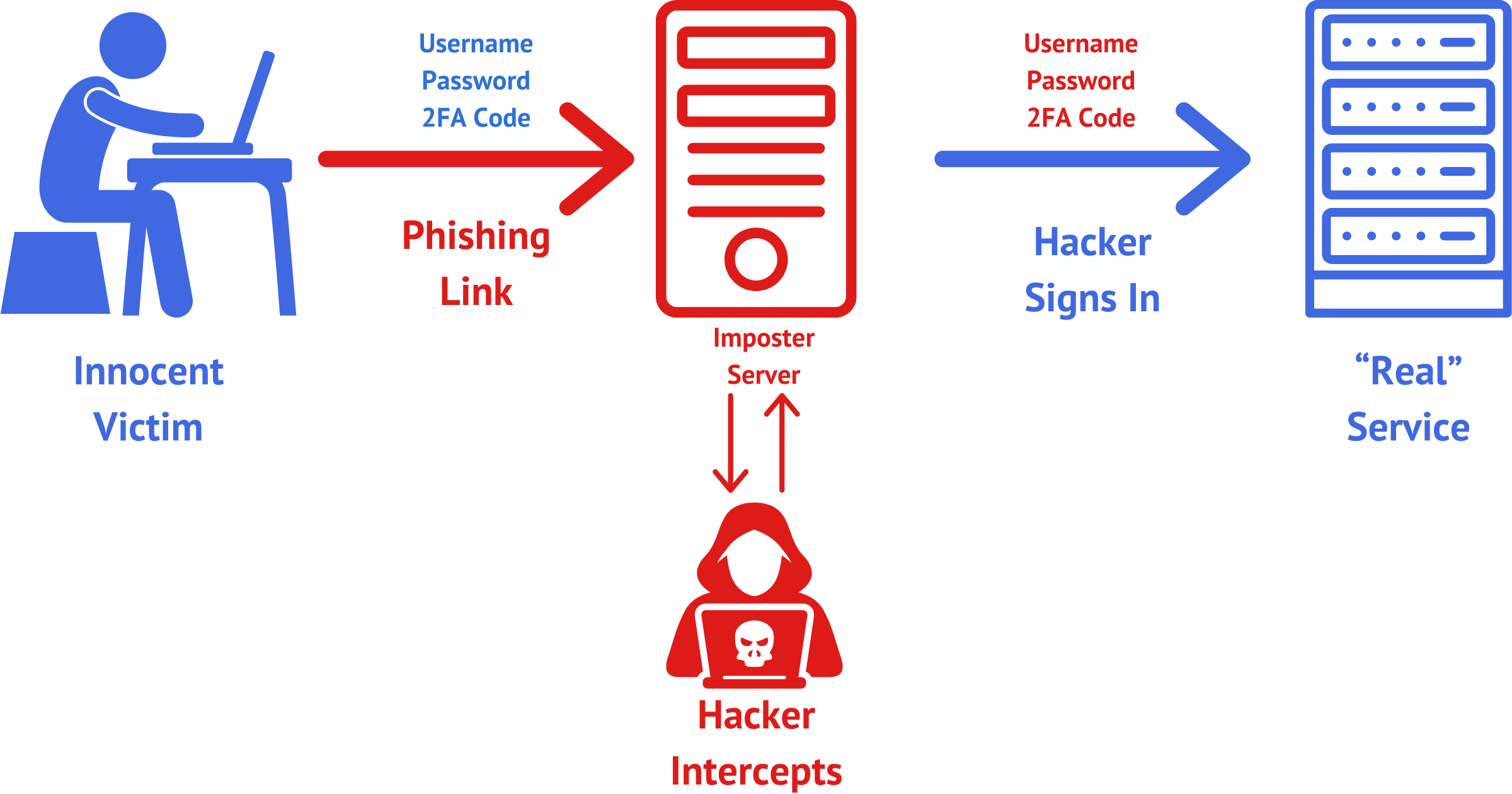One-time-passcode (OTP) two-factor authentication (2FA) methods can be vulnerable to phishing and man-in-the-middle (MITM) attacks. Attackers try to deceive you into providing your 2FA codes and then use them in real time to log in as you. 2FA remains a critical security measure; hardware keys offer the strongest protection against these attacks.