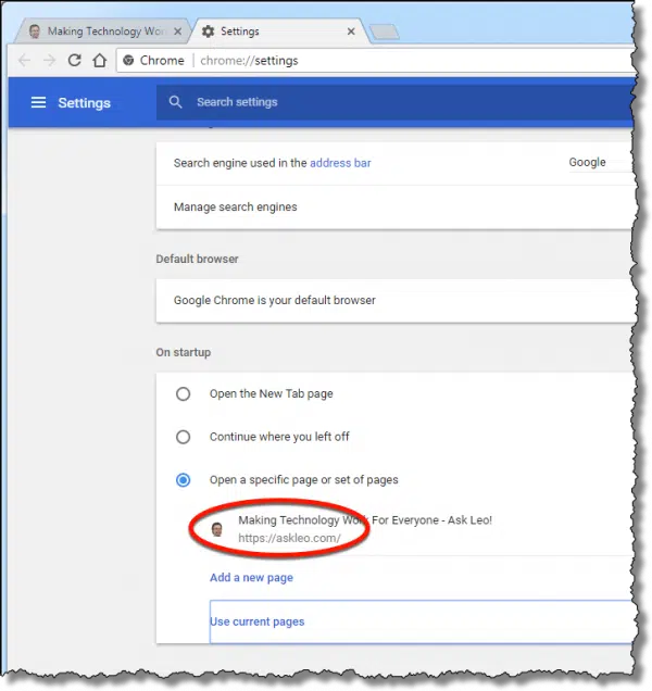 Click on Open a specific page or pages, and then Add a new page. You’ll be presented with a small box into which you can enter the URL2 of the page you want to be your browser’s homepage. Click OK, and it’s set. In the example above, I’ve set https://askleo.com as my browser’s homepage.