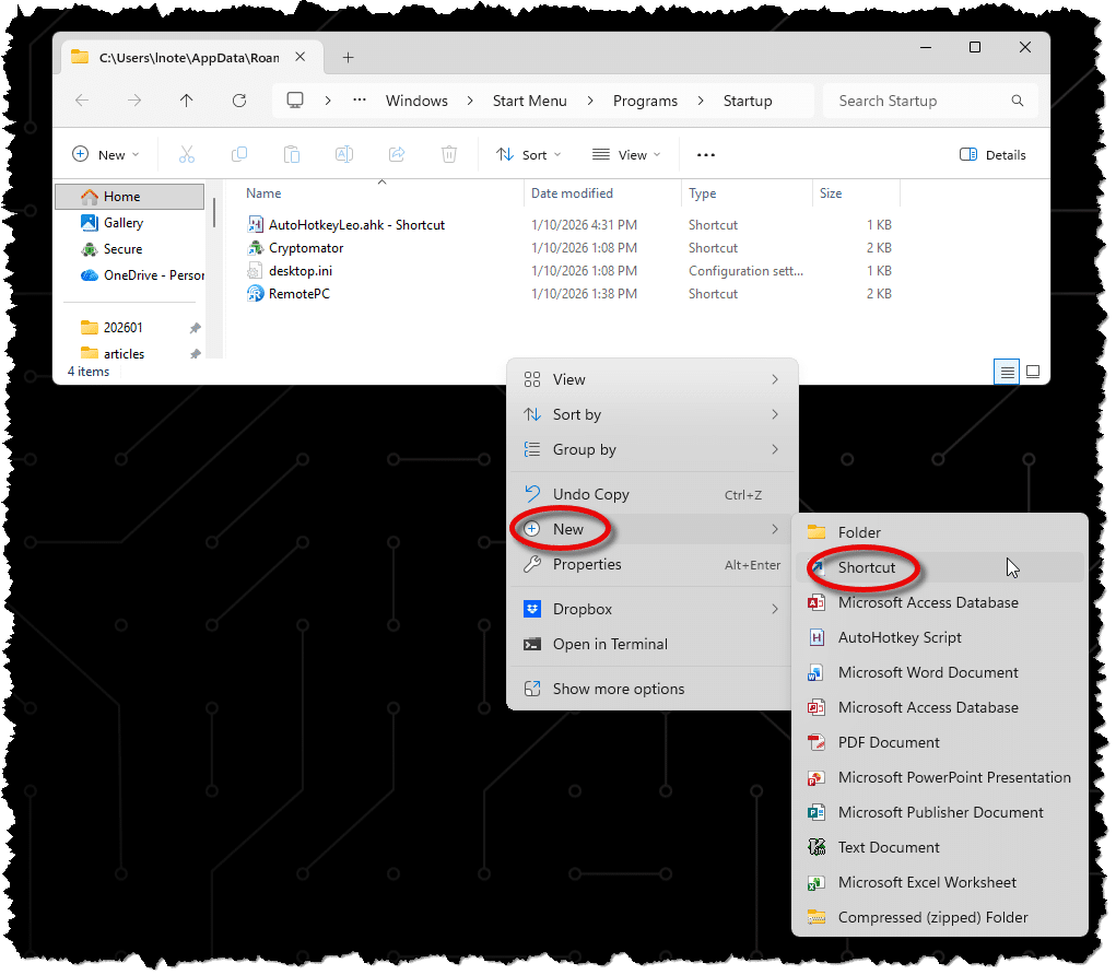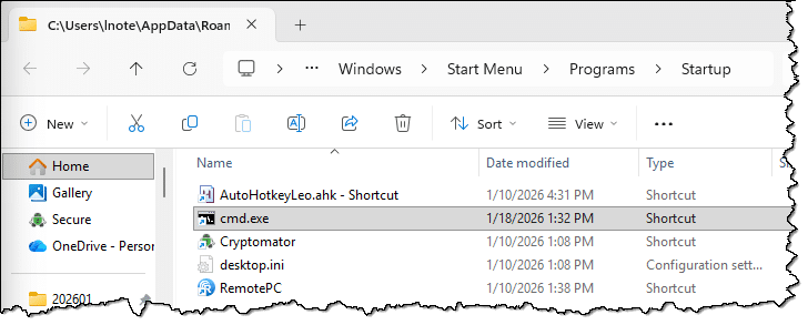 Installed programs that automatically run something on startup often place their shortcuts in that folder. The “Cryptomator” shortcut you see there was added by Cryptomator’s setup program. Others, such as “AutoHotkeyLeo.ahk – Shortcut”, I created manually.