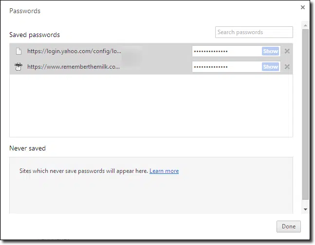 While you can delete each password one at a time by clicking on the “x” to its right, it’s easiest to clear all by typing CTRL+A to select all of them, and then pressing Delete.