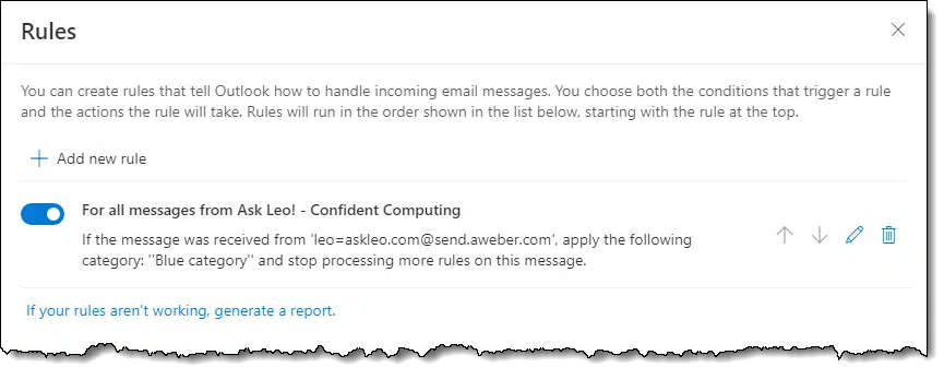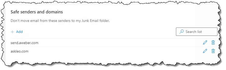 - Add an email domain, such as “askleo.com”, to indicate that messages from any email address on that domain should never be marked as spam. Use this sparingly. For example, you should never specify a general-purpose domain like “gmail.com” or “outlook.com”, since lots of spam comes from those domains. However, you might specify the email domain of your bank or other important senders, so you’ll get all their emails regardless of who at that company sends them.