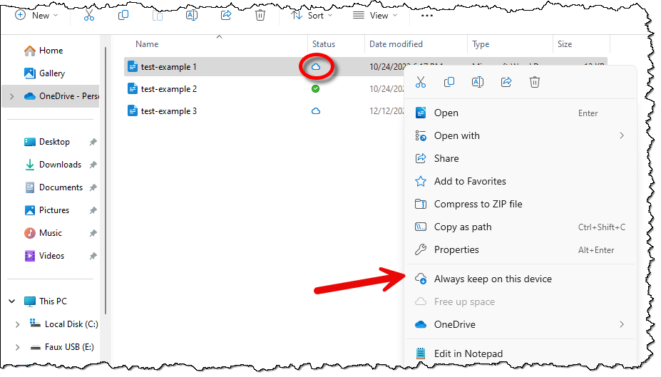 - Right-click the file and then click on “Always keep on this device”. This causes the data to be downloaded. The icon changes to a solid circled checkmark. This file remains on your machine until or unless you change that state or delete the file from OneDrive (here, at OneDrive.com, or at any PC linked to this same OneDrive account).