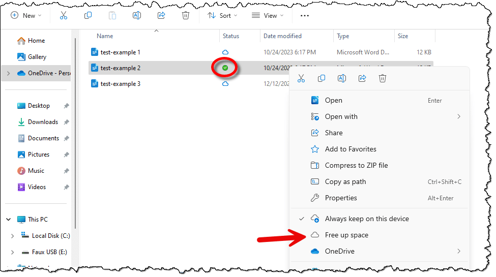 In this example, test-example-2 is completely downloaded and on your PC, as indicated by the solid circled checkmark. Right-click on the file and you’ll see that “Always keep on this device” shows a checkmark in front of it as well. You can click on Free up space, and the data will be removed only from your PC, freeing up the space. To use the file again, you’ll need to download the data using one of the methods above.