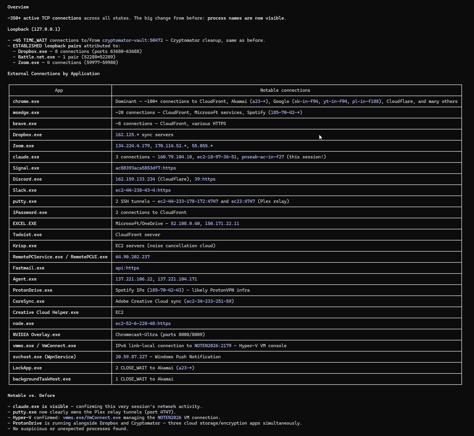 I fed the full netstat -b output to Claude Code AI and asked for an analysis.