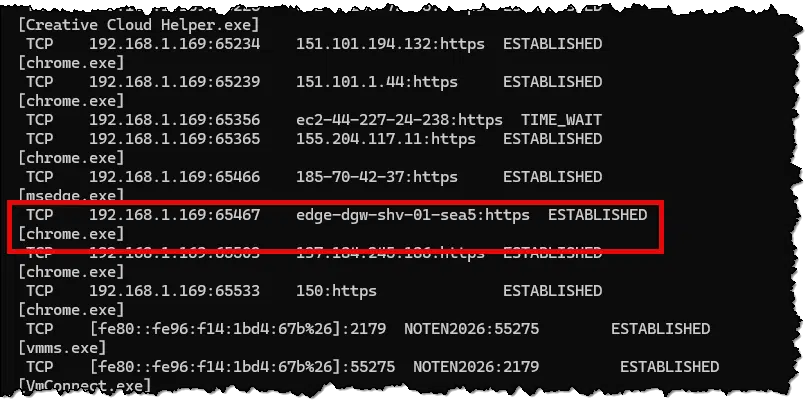 I’ve highlighted one entry to use as an example. My machine — 192.168.1.169, using port number 65467 — has connected to edge-dgw-shv-01-sea5 using https. Great, but what is edge-dgw-shv-01-sea5? A little research (via Claude AI) tells us: