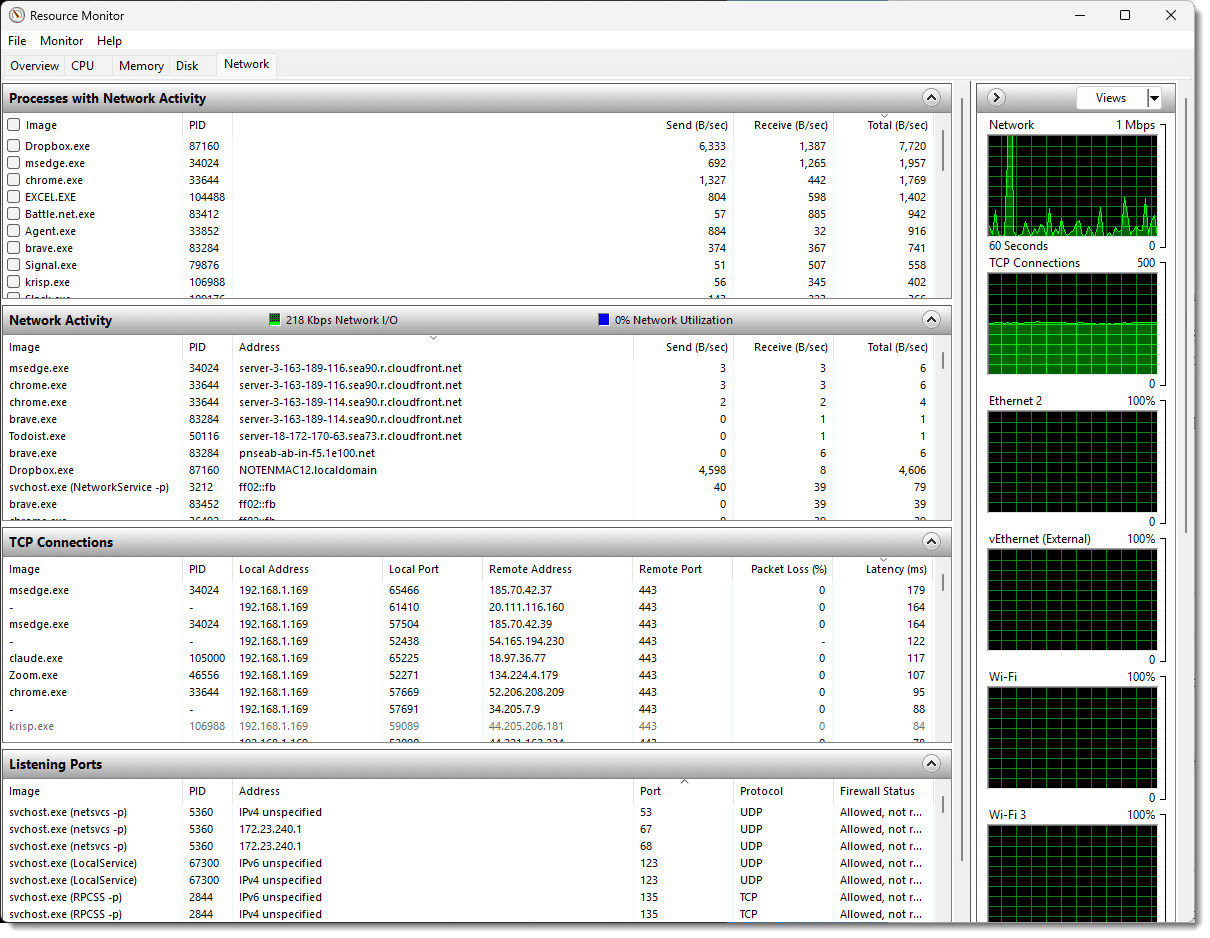 Another tool built into Windows that can provide a quick overview is Resource Monitor. It doesn’t have the detail of TCPView, but it can quickly inspect your network activity.