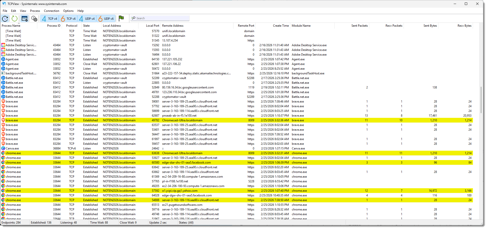 - Click on the column headers to sort by the contents of that column. For example, clicking on the “Sent Bytes” column shows me that Dropbox has been responsible for the majority of data being sent by my machine since I started TCPView. (Chrome’s #2, likely because I’m writing this article directly on my website using Chrome and periodically saving drafts.)
