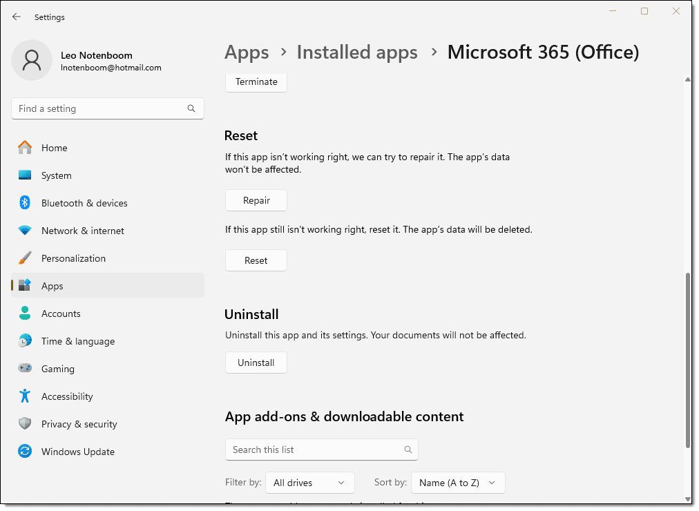 There are two Microsoft 365 entries, and I’m not sure why. I’m selecting the one that includes (Office) and has a size associated with it. Click the ellipsis to its right and click on Advanced Options (not shown here). This will open a page with additional information about your installation of Microsoft Office, including several actions you can take.