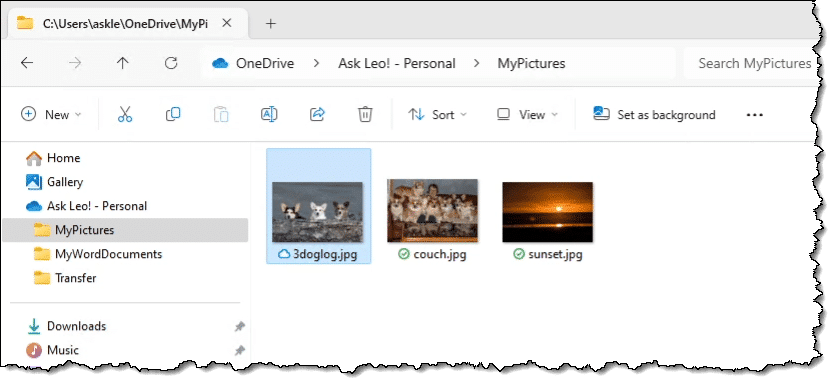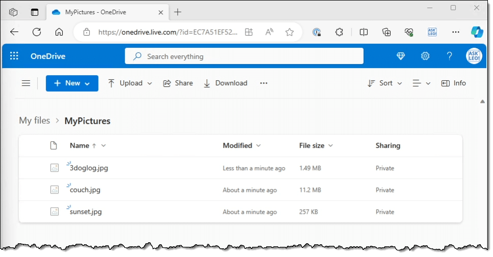 Those files are on my computer, in a subfolder of my OneDrive folder called “C:\Users\askle\OneDrive\MyPictures”. Since they’re in my OneDrive folder, they’ve also automatically been uploaded to my online OneDrive account.