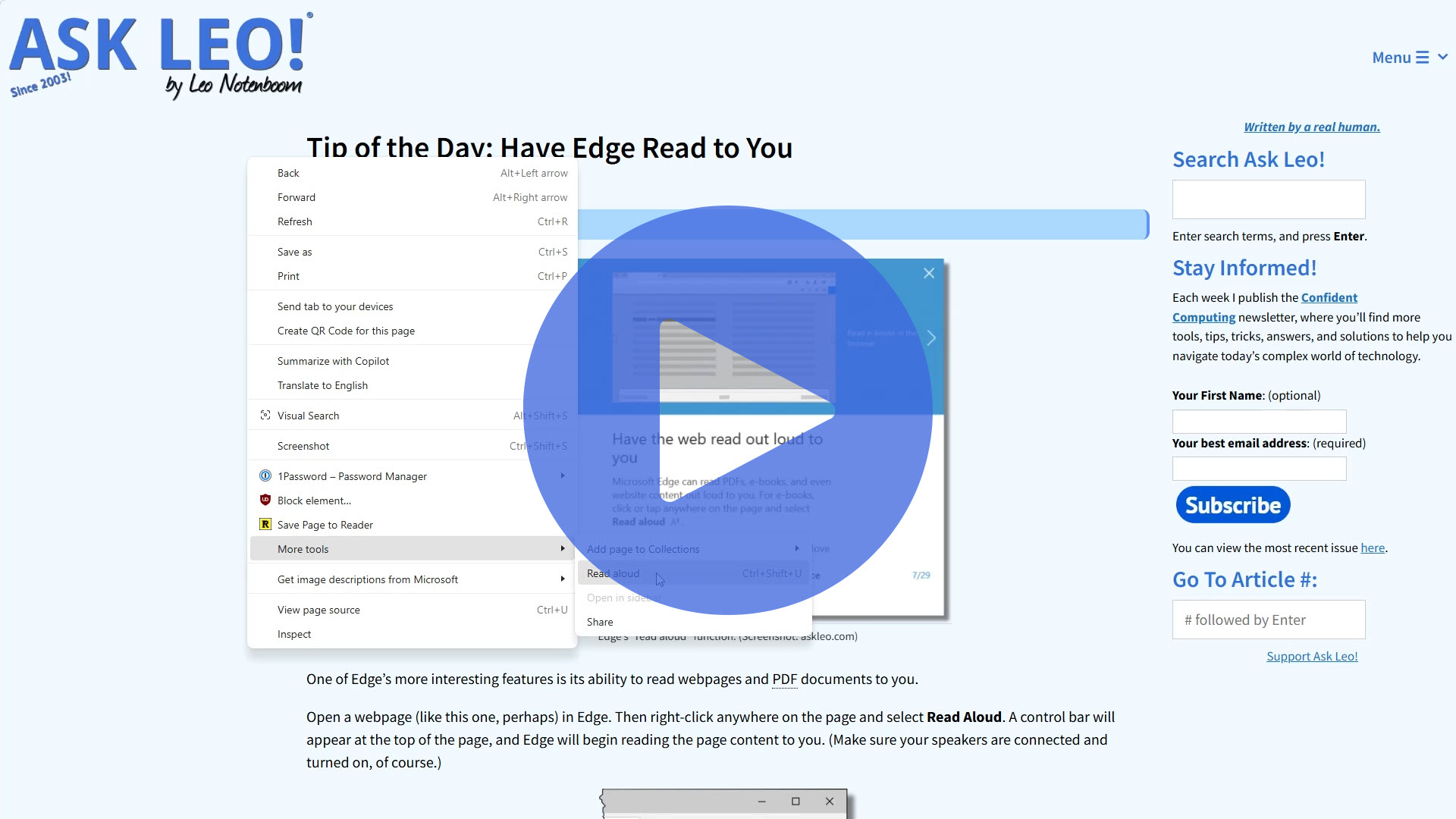 Open a webpage (like this one, perhaps) in Edge. Then right-click anywhere on the page and select Read Aloud. A control bar will appear at the top of the page, and Edge will begin reading the page content to you. (Make sure your speakers are connected and turned on, of course.)