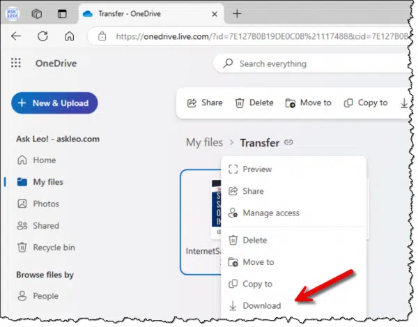 In the example above, I’ve moved into the “Transfer” folder in “My files”, where I’ve right-clicked on a copy of my Internet Safety PDF. Clicking on Download will download the file from OneDrive.com online to my computer.