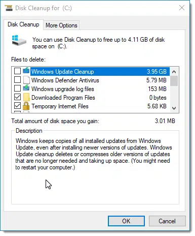 - Windows Update Cleanup. This can free up a lot of space, but it comes at a cost. Once you’ve deleted these backup files, Windows update items on your machine cannot be uninstalled. Fortunately, the need for this rare; typically, cleaning these files is a fine idea.