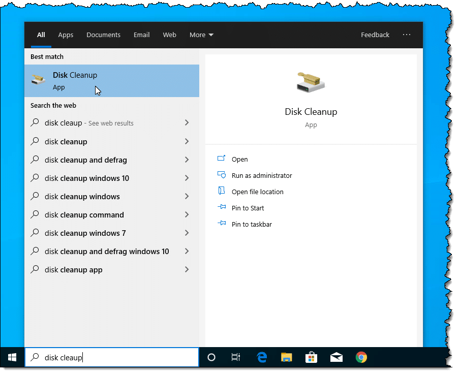 In Windows 10, click the Start button and start typing “disk cleanup”.