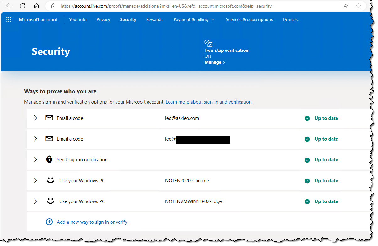 If you see an envelope followed by “Email a code”, that line lists a recovery email address. You can see I have two configured for this account: leo@askleo.com and an additional one. I also have options to send a sign-in notification to the Microsoft authenticator on my smartphone or use Windows Hello on two other machines.