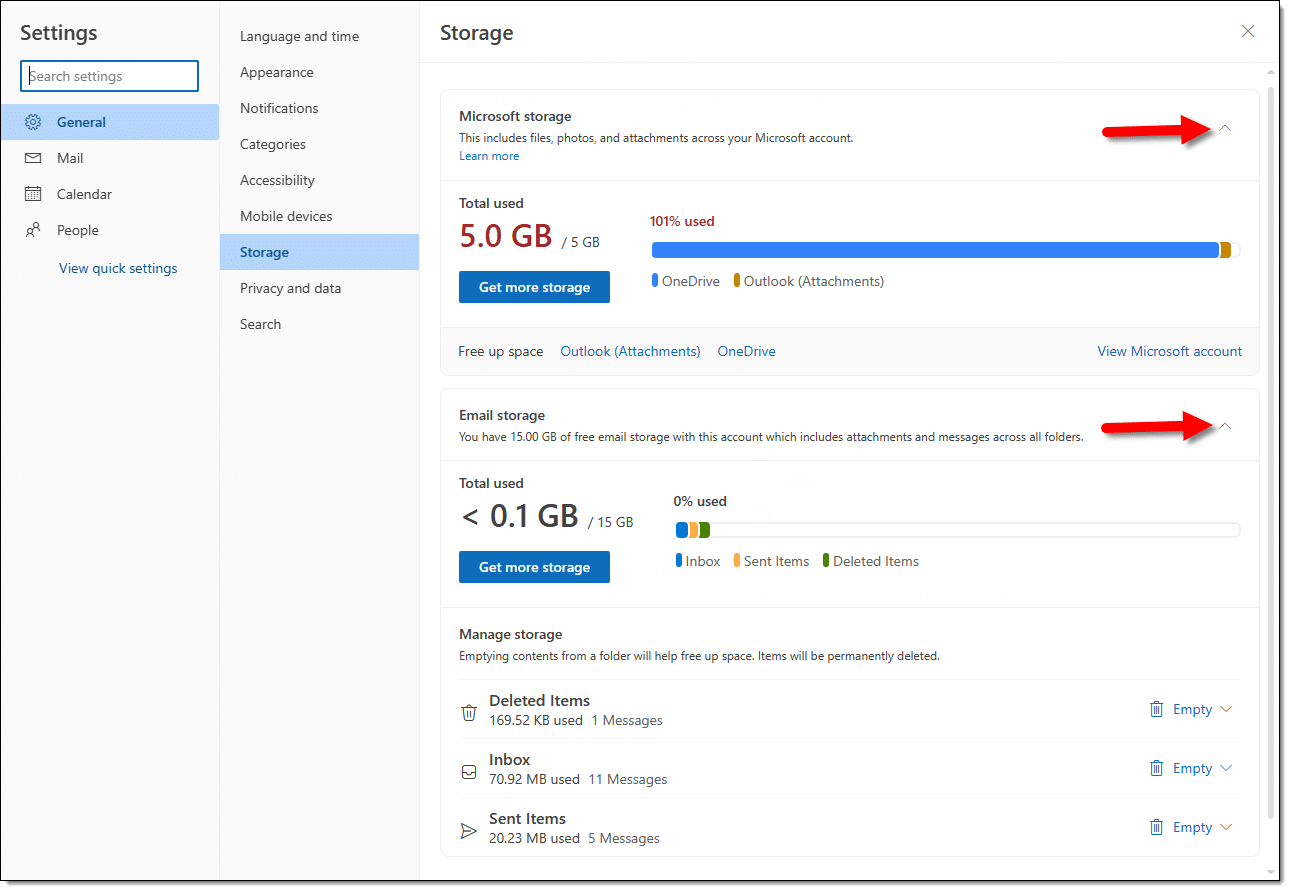 Be sure that both “Microsoft storage” and “Email storage” are expanded by clicking the small down-arrows in the positions indicated (they’re up-arrows in the image, as they’ve already been clicked).