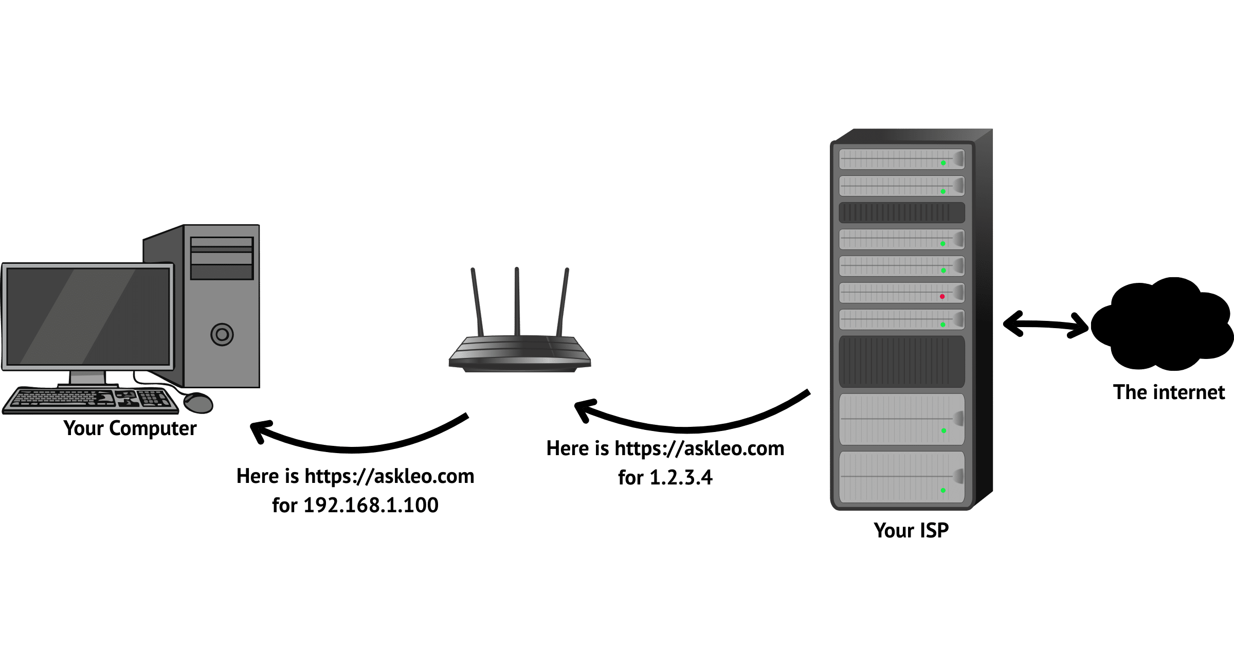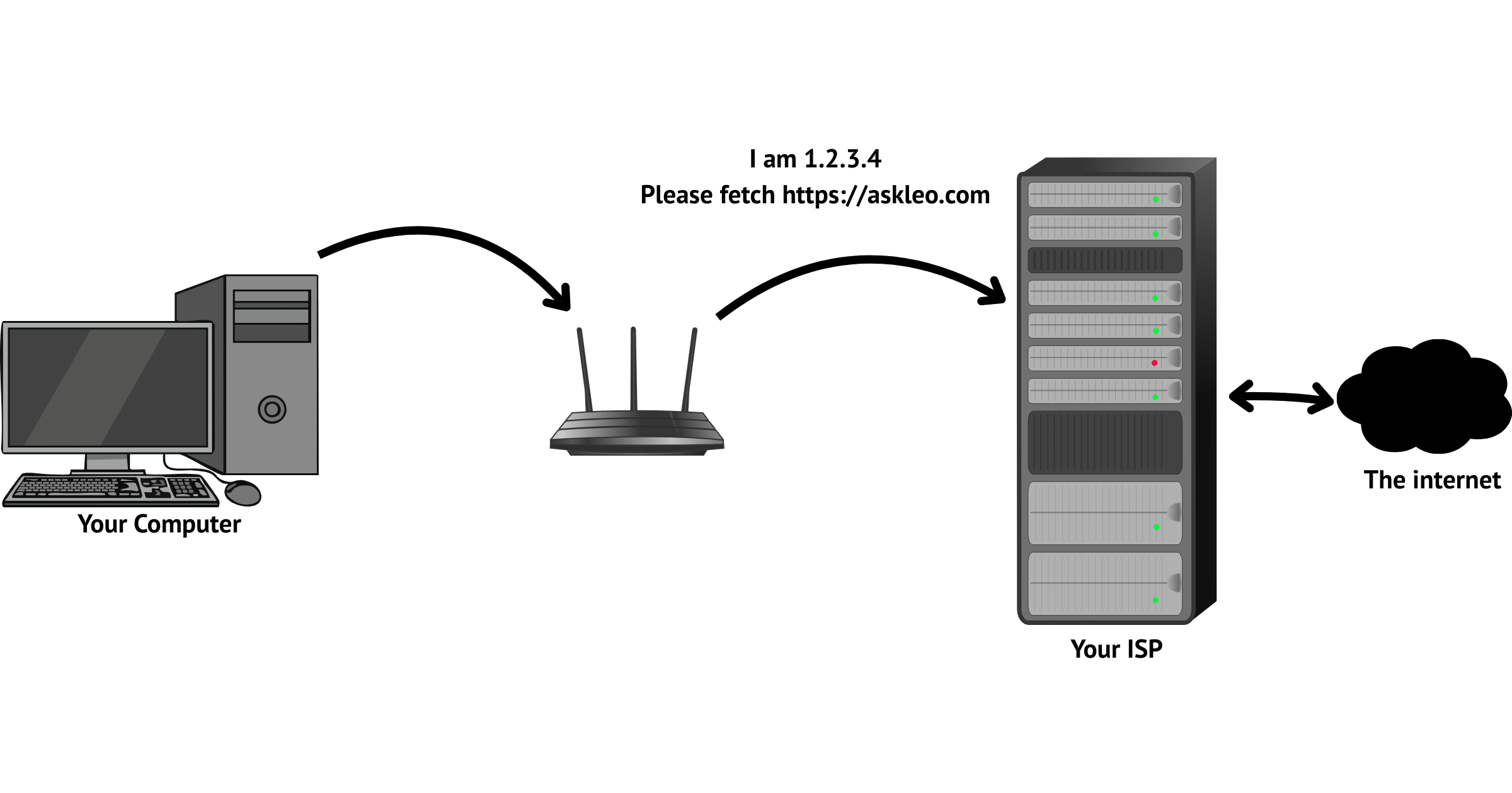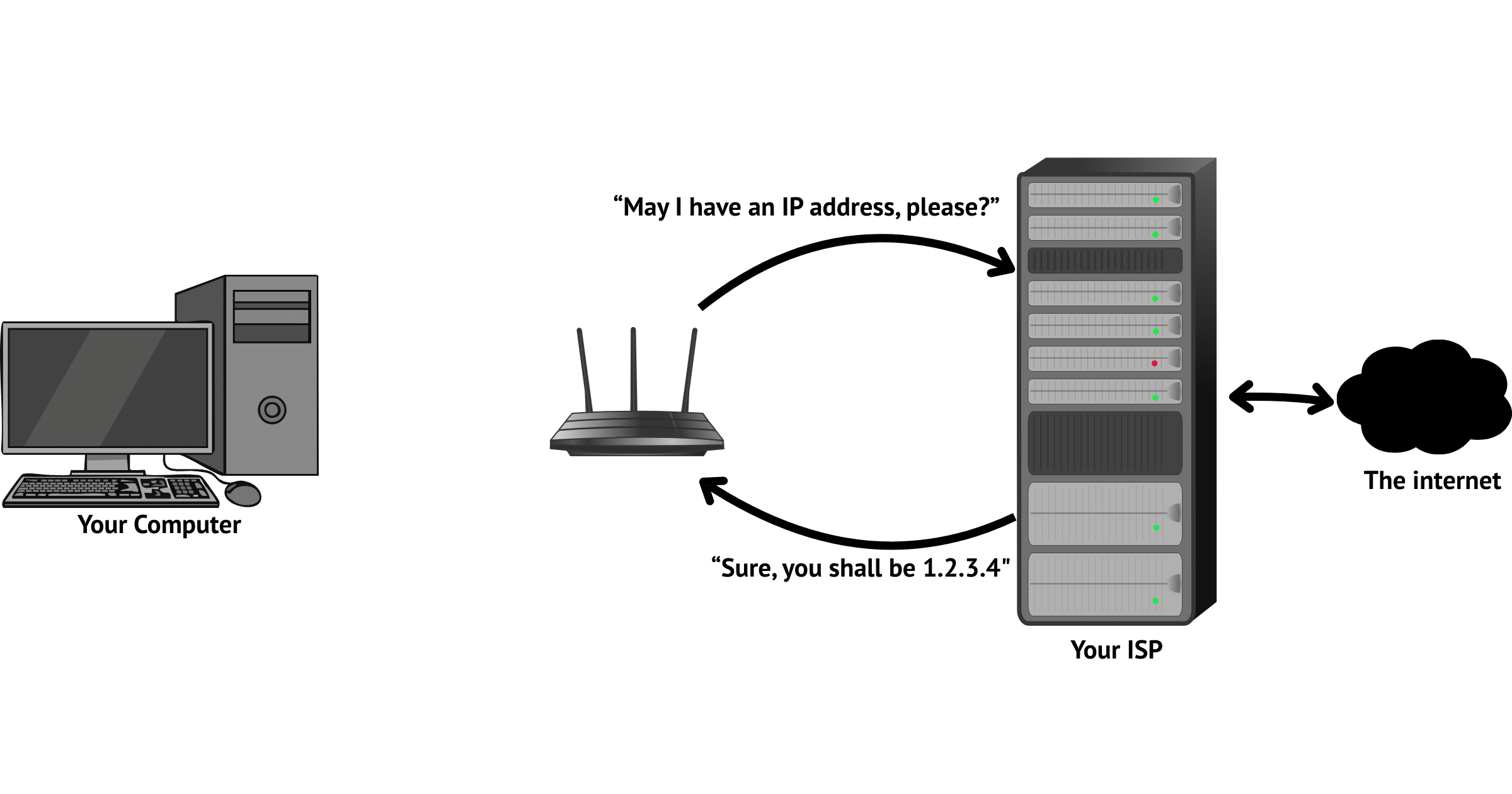 Let’s insert a router into the mix. It sits between the computer and the internet. When you turn it on or attach it to your ISP’s provided connection, one of the first things it does is ask for an IP address.