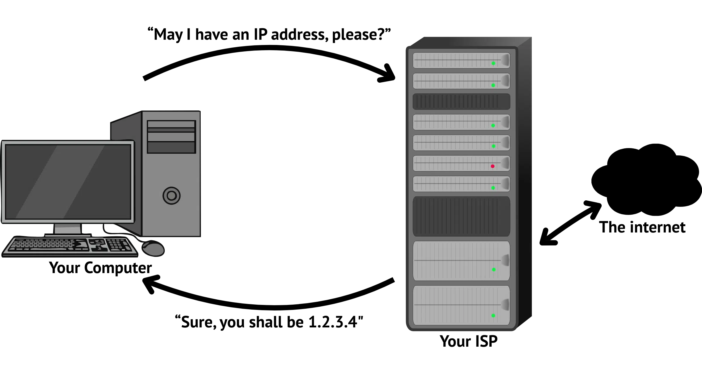 In this example, your computer uses a protocol called DHCP (for Dynamic Host Configuration Protocol) to connect to its ISP or network provider. It asks for an IP address, and the ISP assigns one. From here, that IP address identifies that computer on the internet. The IP address may change: each time the computer connects, it may be given a different IP address. That’s why it’s called a dynamic IP address.